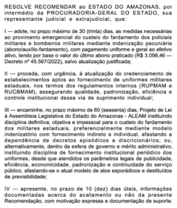 Os promotores de Justiça Daniel Silva Chaves Amazonas de Menezes e Armando Gurgel Maia, da 60ª e 61ª promotorias de Justiça Especializadas no Controle Externo da Atividade Policial e Segurança Pública do Ministério Público do Estado do Amazonas recomendaram ao Estado do Amazonas que adote, no prazo máximo de 30 dias, medidas necessárias ao provimento emergencial do custeio do fardamento dos policiais militares e bombeiros militares mediante indenização pecuniária (abono/auxílio-fardamento), com pagamento uniforme e geral ao efetivo ativo, tendo por base o valor do último abono praticado (R$ 3.098,46 — Decreto nº 45.567/2022), salvo atualização justificada.